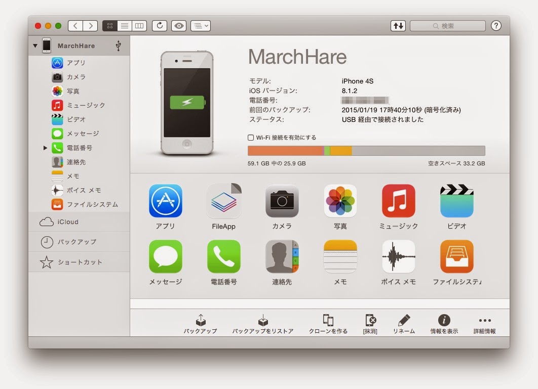 操作できる項目は、アプリ、写真、音楽、ビデオ、メッセージ、連絡帳、メモ、ボイスメモの各項目と、そしてファイルシステムを直に操作することができます。